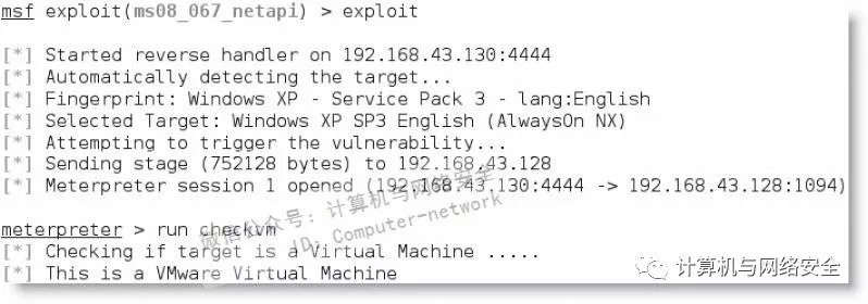 我们必须确认的第一个事实是:我们是否在一个虚拟机上?使用meterpreter,打开受损系统和攻击者之间的会话,执行run checkvm命令,如下图所示。返回的数据表明,这是一个VMware虚拟机。
