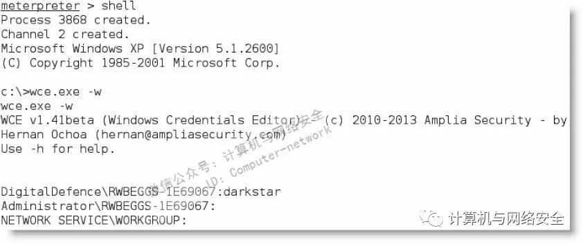 在meterpreter命令提示符下使用WCE,将executable上传到被感染的系统中。然后初始化一个交互式的shell并执行WCE。正如你在下图中看到的,-w选项很容易提取明文管理员密码。