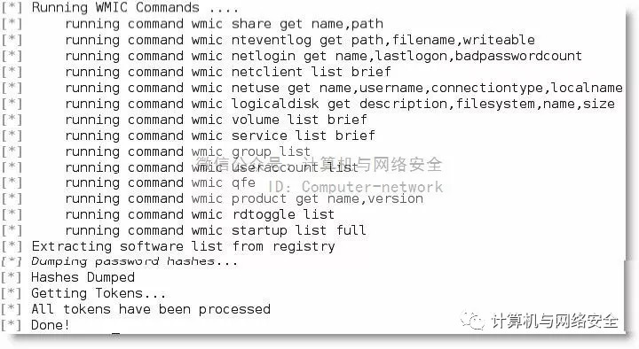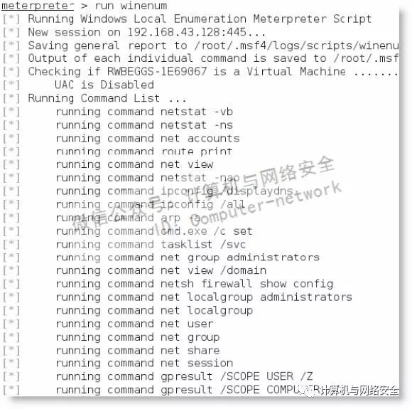 Windows enumerator(winenum)是最有效的meterpreter脚本之一。如下图所示,它同时使用命令行和WMIC来获得目标系统的全面表征。