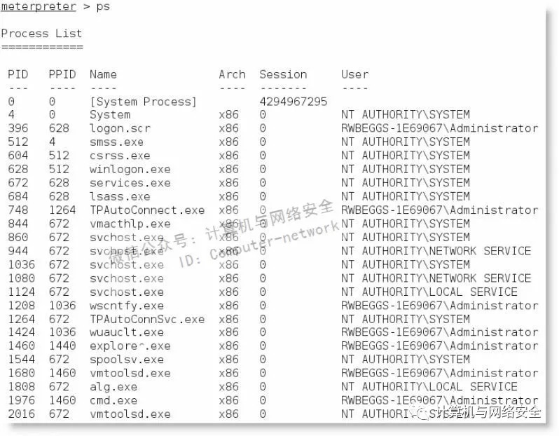 在meterpreter的提示下,输入ps来获得一系列的运行进程,如下图所示。