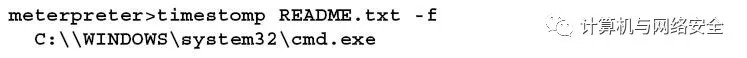 如果我们想隐藏这个文件,我们可以将其移动到一个杂乱的目录,如Windows\System32下。但是,这个文件对于那些根据创建时间或其他MAC参数进行排序的人,是显而易见的。因此,使用下面的命令,将cmd.exe文件中的MAC信息复制到README.txt文件中。