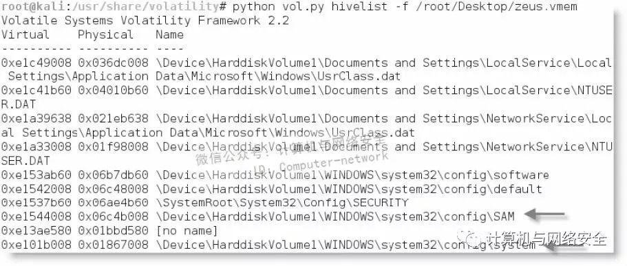 当执行下列命令时,hivelist插件将对不同的hives注册表打印出初始的虚拟内存位置:
