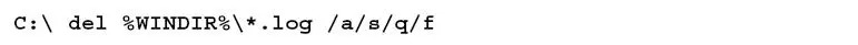 /a选项直接删除所有日志,/s选项删除包括所有子文件夹的文件。/q选项禁用所有的查询,这些查询要求有一个yes或者no的回应,/f选项强行删除文件,使得恢复更加困难。