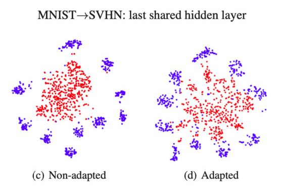 下图是一个典型的领域适应问题的效果展示图,左图是不使用领域适应的算法,右图是使用领域适应的算法。通过对抗训练,特征提取器会把源领域与目标领域对应的数据集拉近,使它们难以被判别器区分。