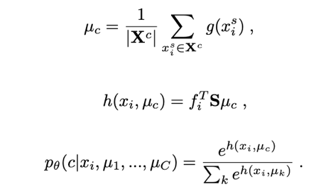 也就是说,对于源数据集的每个类用类内数据点算一个类中心,然后用类中心与特征提取器提出的特征算出 logits,然后用 softmax 函数算出概率。