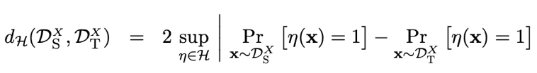 从上述公式可以看出,H- 散度的提供了一种量化描述不同领域差异的方法,即用其中一个领域的数据训练出来的分类器,在两个领域上预测结果,其结果的差异作为这两个领域差异的上界(Upper Bound)。