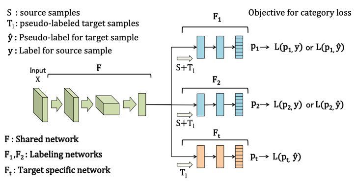 这篇论文放弃了对抗训练的思想,而是引入了伪标签的方法来打分。相比直接打伪标签的方法,这篇论文使用了两个网络来一起打伪标签,只把目标数据集中两个网络给相同预测标签的数据(并且其预测标签概率大于一定阈值,例如0.9)拿出来训练目标数据集的分类器。