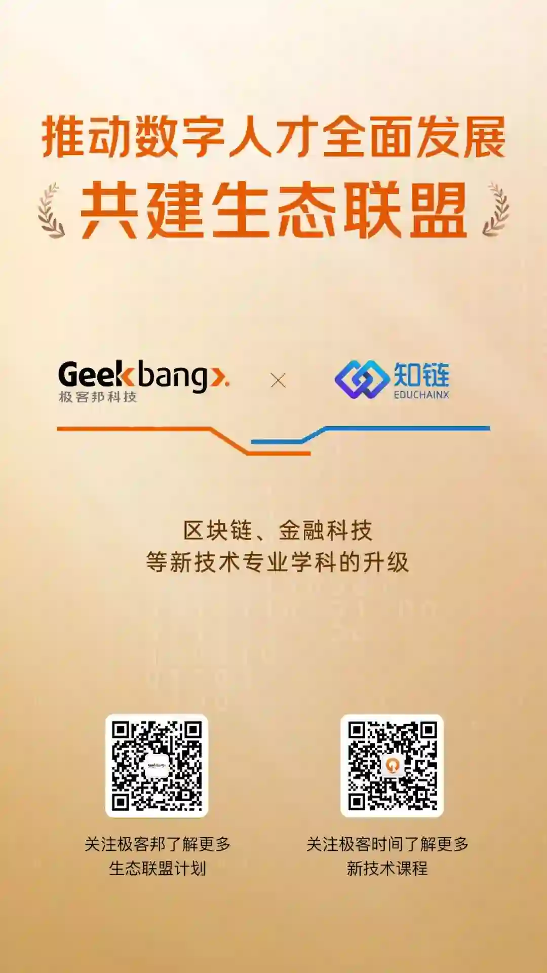 近日,极客邦科技与中国领先的区块链和金融科技产业人才培养整体解决方案提供商知链科技达成战略合作协议,双方就区块链、金融科技等新技术专业学科的升级进行深入合作。