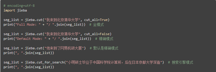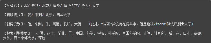搜索引擎模式,在精确模式的基础上,对长词再次切分,提高召回率,适合用于搜索引擎分词。