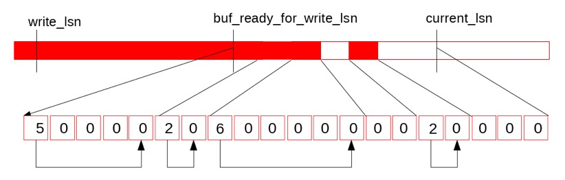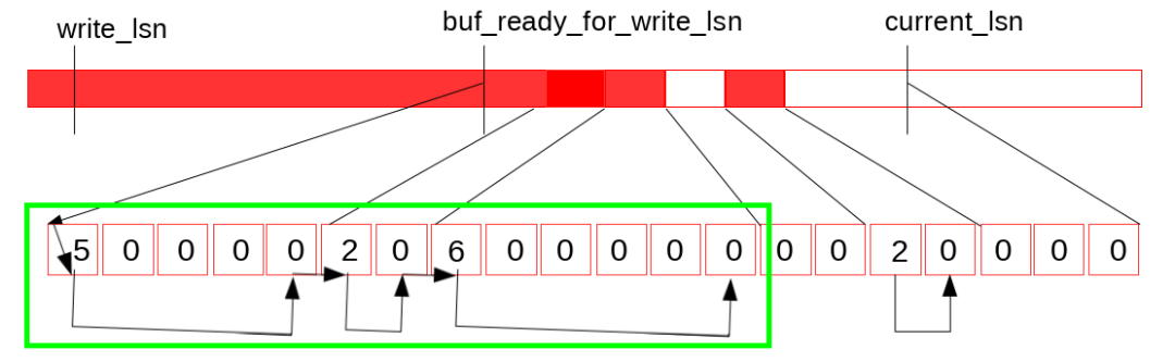 link_buf是一个循环使用的数组,对每个lsn取模可以得到其在link_buf上的一个槽位,在这个槽位中记录REDO长度。另外一个线程从开始遍历这个link_buf,通过槽位中的长度可以找到这条REDO的结尾位置,一直遍历到下一位置为0的位置,可以认为之后的REDO有空洞,而之前已经连续,这个位置叫做link_buf的tail。下面看看log_writer和众多mtr是如何利用这个link_buf数据结构的。这里的这个link_buf为log.recent_written,如下图所示: