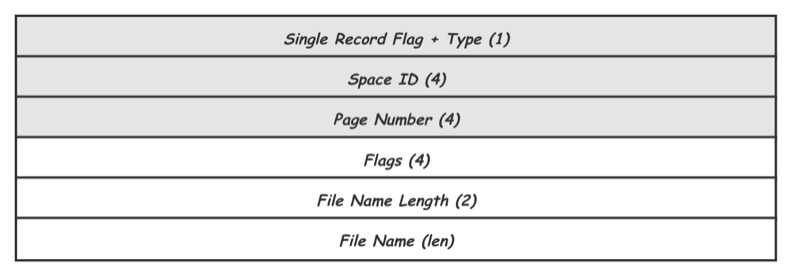 同样的前三个字段还是Type,Space ID和Page Number,由于是针对Page的操作,这里的Page Number永远是0。在此之后记录了创建的文件flag以及文件名,用作重启恢复时的检查。