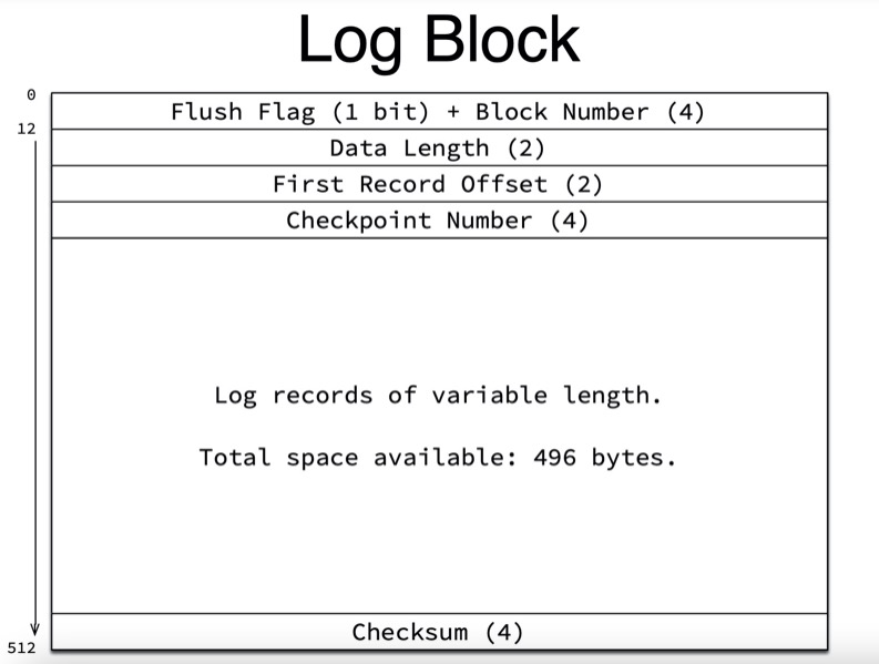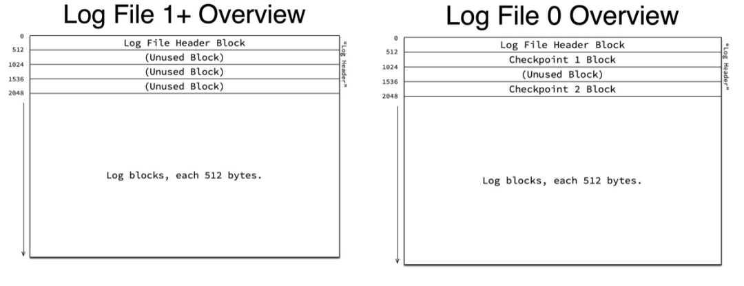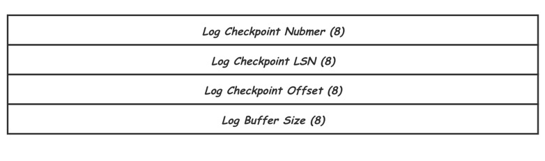 首先8个字节的Checkpoint Number,通过比较这个值可以判断哪个是最新的Checkpiont记录,之后8字节的Checkpoint LSN为打Checkpoint的REDO位置,恢复时会从这个位置开始重放后边的REDO。之后8个字节的Checkpoint Offset,将Checkpoint LSN与文件空间的偏移对应起来。最后8字节是前面提到的Log Buffer的长度,这个值目前在恢复过程并没有使用。