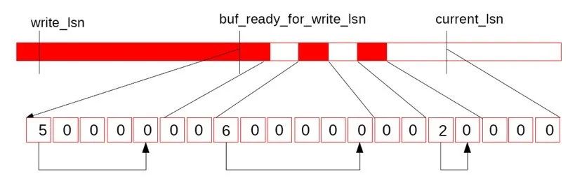 写入到Log Buffer中的REDO数据需要进一步写入操作系统的Page Cache,InnoDB中有单独的log_writer来做这件事情。这里有个问题,由于Log Buffer中的数据是不同mtr并发写入的,这个过程中Log Buffer中是有空洞的,因此log_writer需要感知当前Log Buffer中连续日志的末尾,将连续日志通过pwrite系统调用写入操作系统Page Cache。整个过程中应尽可能不影响后续mtr进行数据拷贝,InnoDB在这里引入一个叫做link_buf的数据结构,如下图所示: