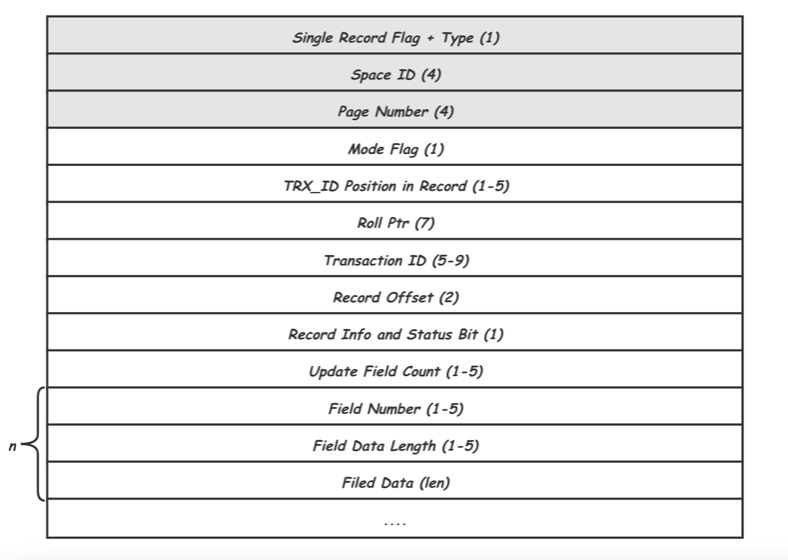 其中,Type就是MLOG_REC_UPDATE_IN_PLACE类型,Space ID和Page Number唯一标识一个Page页,这三项是所有REDO记录都需要有的头信息,后面的是MLOG_REC_UPDATE_IN_PLACE类型独有的,其中Record Offset用给出要修改的记录在Page中的位置偏移,Update Field Count说明记录里有几个Field要修改,紧接着对每个Field给出了Field编号(Field Number),数据长度(Field Data Length)以及数据(Filed Data)。
