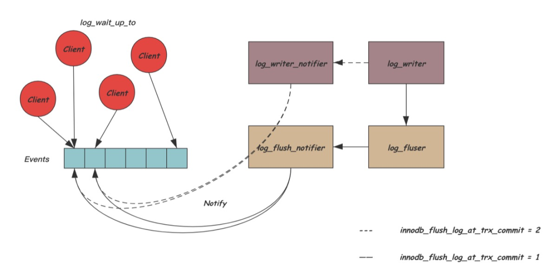 大量的用户线程调用log_write_up_to等待在自己的lsn位置,为了避免大量无效的唤醒,InnoDB将阻塞的条件变量拆分为多个,log_write_up_to根据自己需要等待的lsn所在的block取模对应到不同的条件变量上去。同时,为了避免大量的唤醒工作影响log_writer或log_flusher线程,InnoDB中引入了两个专门负责唤醒用户的线程:log_wirte_notifier和log_flush_notifier,当超过一个条件变量需要被唤醒时,log_writer和log_flusher会通知这两个线程完成唤醒工作。下图是整个过程的示意图: