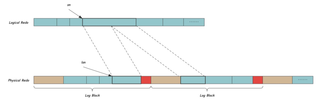 由于增加了Block Header和Tailer的字节开销,在物理REDO空间中用LSN来标识偏移,可以看出LSN和SN之间有简单的换算关系:
