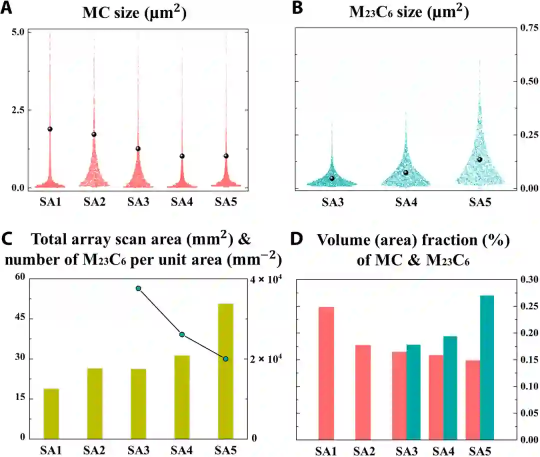 通过机器学习模型进行高通量数据收集和自动相位识别产生的全景图谱可以很容易地转换为数字数据进行统计分析,基于在样本规模区域收集的数据,从中可以快速确定碳化物的尺寸和体积(面积)分数的演变。