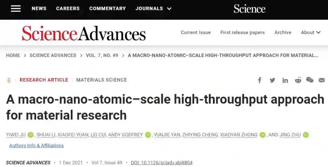 该研究以「A macro-nano-atomic–scale high-throughput approach for material research」为题,于 2021 年 12 月 1 日发表在《Science Advances》上。