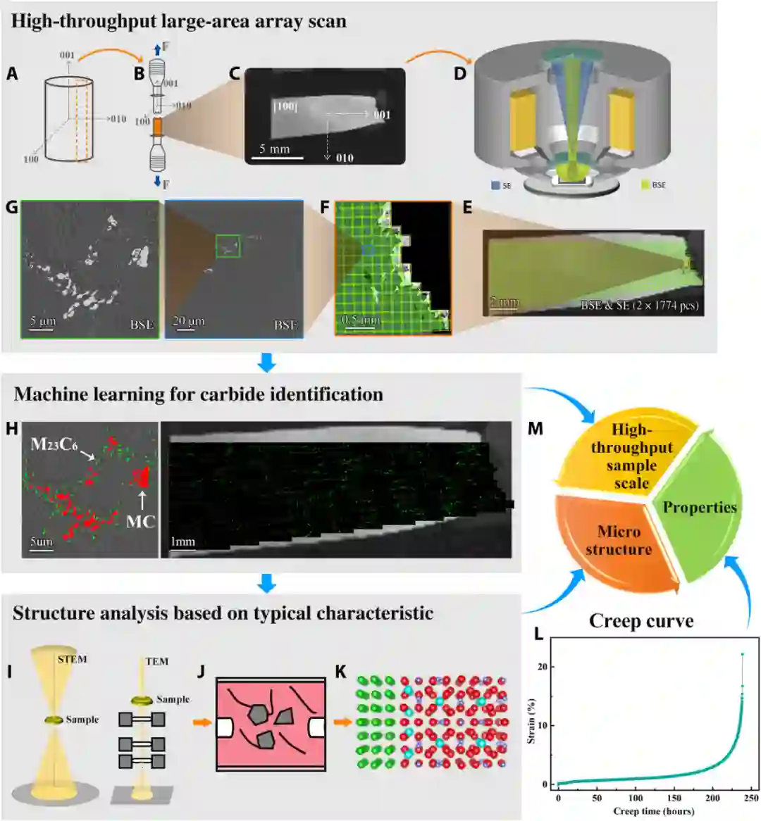 单光束高通量 SEM 方法可以在大样本区域(数十平方毫米)上实现纳米级分辨率的快速多尺度识别和定量分析。然而,确定碳化物的微观结构及其与基体的关系(这两者对于理解碳化物对蠕变性能的影响都很重要),仍然需要一些额外的微观结构分析。