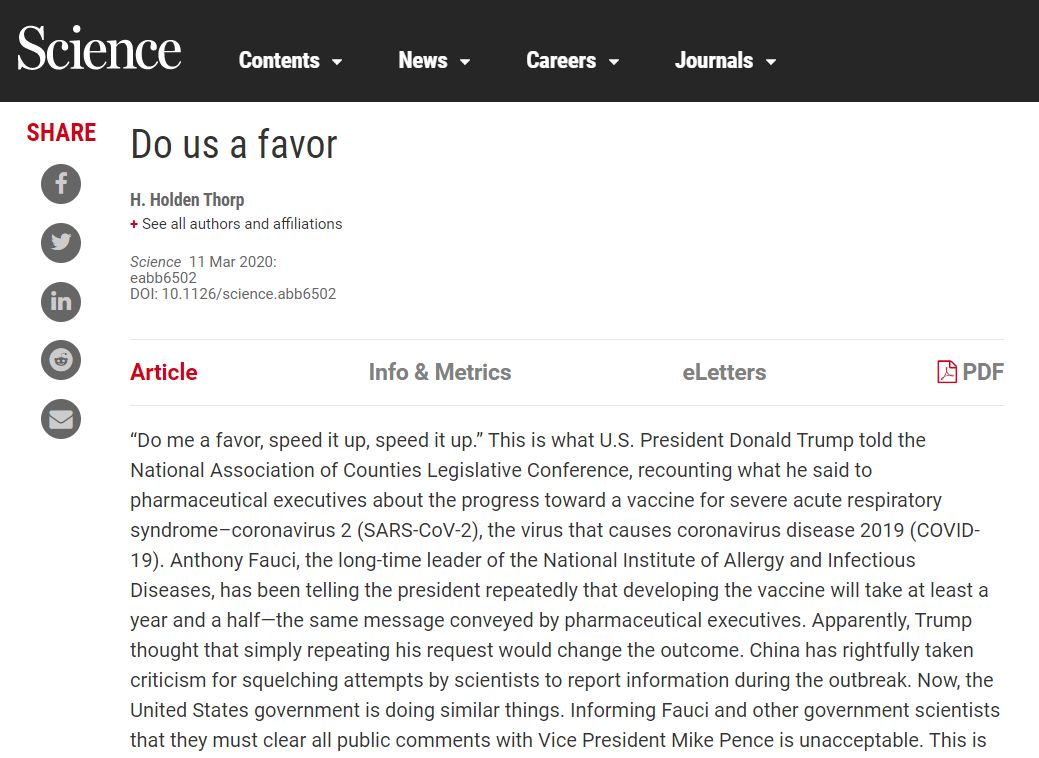 3 月 11 日,世界顶级期刊《科学》杂志主编 H. Holden Thorp 在线发表题为 Do us a favor 的社论文章。在文章中,就特朗普总统多次要求加快新冠肺炎疫苗的研发速度,Holden 表示,美国政府在过去几年内漠视科学、大幅削减科研预算,现在总统突然之间要求快点研制疫苗。