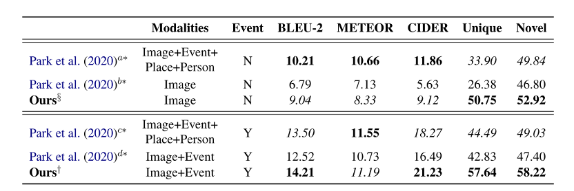 VCG数据集包括了117.4万个训练样本和14.6个测试样本。评价指标为BLEU-2,METEOR,CIDER。此外也计算量了,Unique和Novel指标。Unique即生成的推理句子占比,Novel即训练数据中不存在的句子占比。对比实验如下: