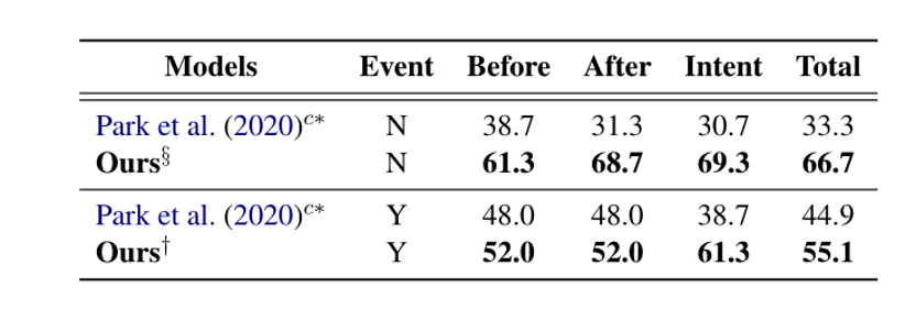 作者从COMET中引入外部知识。COMET是在外部常识知识图谱上预训练的大型语言模型。给定一个自然语言短语和一个关系作为输入,COMET生成自然语言短语作为常识描述。将COMET中xIntent和xWant的预测结果视为intent,将COMET中的xNeed的预测结果视为before,将COMET的预测结果视为after。作者通过这种方式,并对数据进行筛选,从而扩充了预训练数据集。