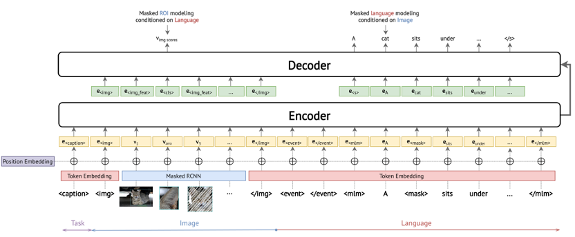•Visual Feature Extractor:通过Masked R-CNN提取图像不同区域特征和每个区域的标签p(v_i )•Cross-Modal Encoder:引入特殊token表示当前任务的类型。对于基于知识的常识生成任务,使用<before>,<after>或者<intent>作为起始标志。对于属性和关系预测任务使用。对于掩码语言任务和掩码区域任务使用<caption>。用<img>和</img>表示图像输入的开始和结束,<event>和</event>表示事件的开始和结束,<mlm>和</mlm>表示文本的开始和结束。•Decoder:自回归的解码器,不将视觉表示当做输入,使用的表示来替换视觉表示。对于掩码语言任务和掩码区域任务使用<cls>代替被掩码的区域或者单词。
