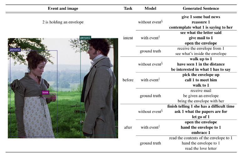 视觉常识生成(VCG)是给定图片和文本(event),生成图片中人物之前会发生什么(before),任务当前的意图(intent),以及之后会发生什么(after)。下图是一个例子: