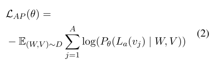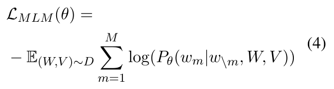 与BERT中类似,以15%的概率随机掩码一些文本单词。在被掩码的单词中80%概率用代替,10%的概率随机替换,10%的概率不变。希望让模型预测出这些被掩码的单词。损失函数如下: