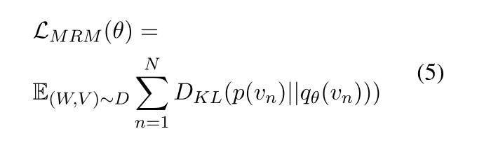 以15%的概率掩码图像区域,即用0向量填充图像。模型需要预测被掩码的区域所属的类别分别。损失函数是最小化输出分布和在视觉特征提取中得到的区域标签概率分布之间的KL散度,公式如下: