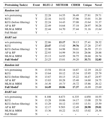 文章将模型架构固定为6层编码器和6层解码器。消融实验的设置如下:(1)不进行预训练(2)只进行KCG预训练任务,同时比较数据过滤前后的模型性能(3)只进行AP和RP任务(4)只进行MLM和MRM任务(5)所有的预训练任务都加上。消融实验结果如下: