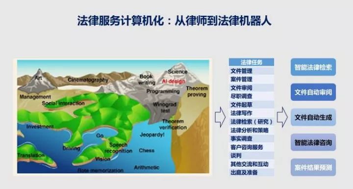 这是一张人类能力地图。最下面的一片汪洋是已经被机器淹没的领域,包括较早的象棋,后来的智力竞赛节目jeopardy,以及最近的围棋、驾驶、翻译等。最上面的能力较为安全,但也正在被这不断上升的汪洋侵吞。这是人类能力的现状,也是法律人的法律能力可能面对的状况。