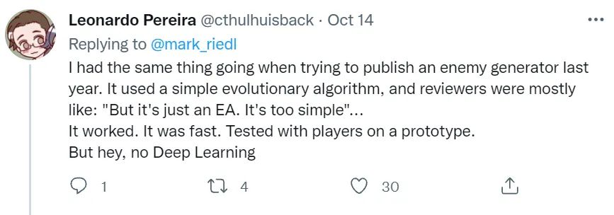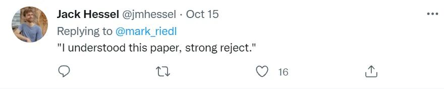 Riedl 教授列出了自己收到的两点退稿理由:一是方法太过简单,二是不满于他只采用了人工评分,而没有使用 BLEU score(尽管他们做的任务是故事生成......)。面对这两个退稿理由, Riedl 教授只能表示"I can't even."