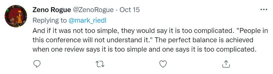 也有使用了朴素的辩证法得出:投稿的最高境界就是让一个评审觉得太简单让另一个评审觉得太难。