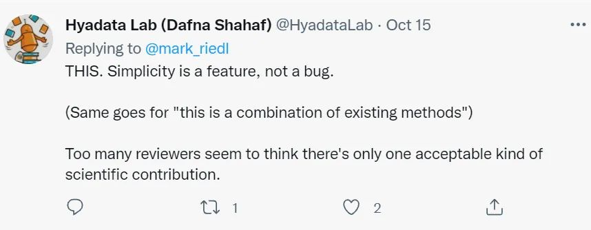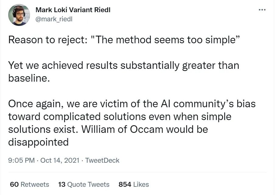 如果你看到自己实验行之有效的论文被退稿,而收到的退稿理由仅仅是“方法太简单”,你会怎么想? 这两天在推特上,佐治亚理工的 Riedl 教授吐槽了自己收到的 AAAI phase 1 退稿理由居然是因为“这方法似乎太简单”,引起了广泛的讨论。 >>加入极市CV技术交流群,走在计算机视觉的最前沿