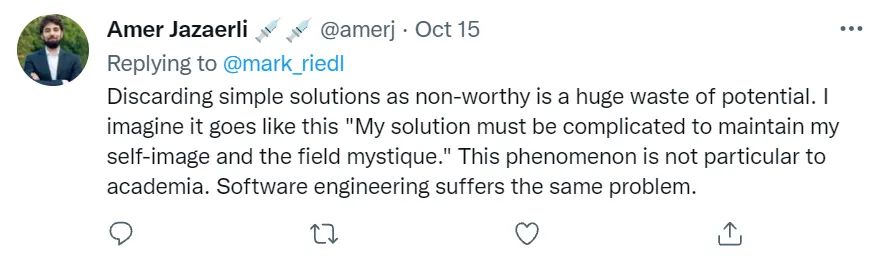 在推文中, Riedl 教授使用了奥卡姆剃刀原理为自己辩护,即“因为‘如无必要,勿增实体’,那么如果我的解决方法简单有效,为什么还要求我使用一个复杂模型呢?”。然而,奥卡姆剃刀原理作为一个经验性的法则,它并不是“保真”的。换言之,奥卡姆剃刀原理它并不一定在所有情况下都正确。事实上,我们会发现用于论证这个法则的常常是一些安排妥当的例子,譬如在管理学的课堂上经常讲述这样一个故事: