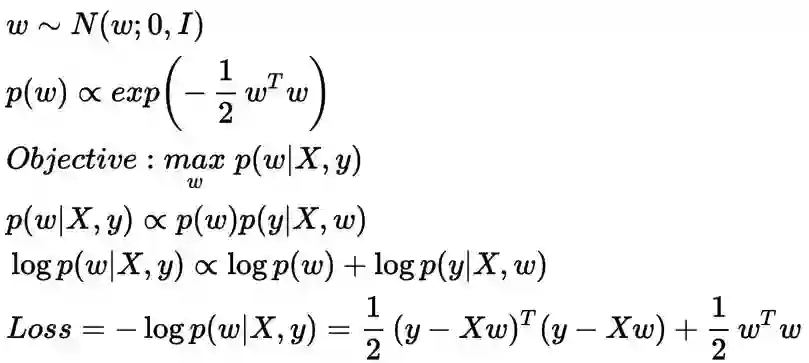 在上面的公式中,我们定义权重w的先验是零均值,单位方差的高斯分布,以及使用负对数后验分布来进行损失函数的求解。在这种情况下,w的先验分布试图保持其平均值为0的权重值。这个过程称为L2正则化(岭回归),其在优化时约束权重参数w的值,这可以在损失函数中看到。