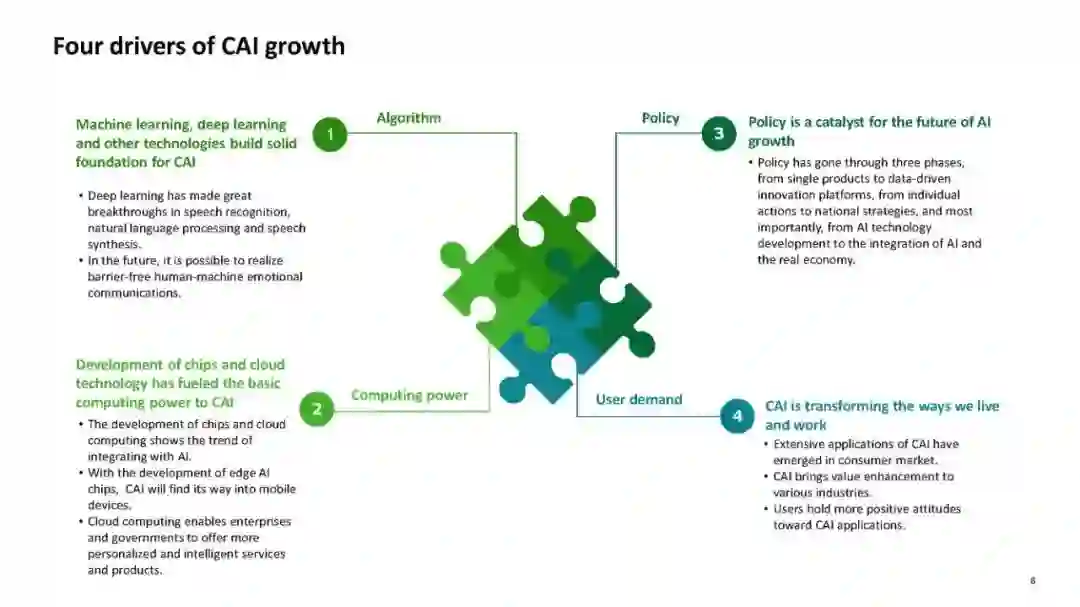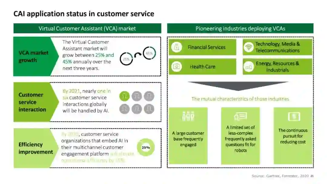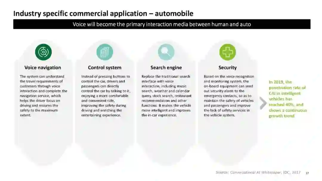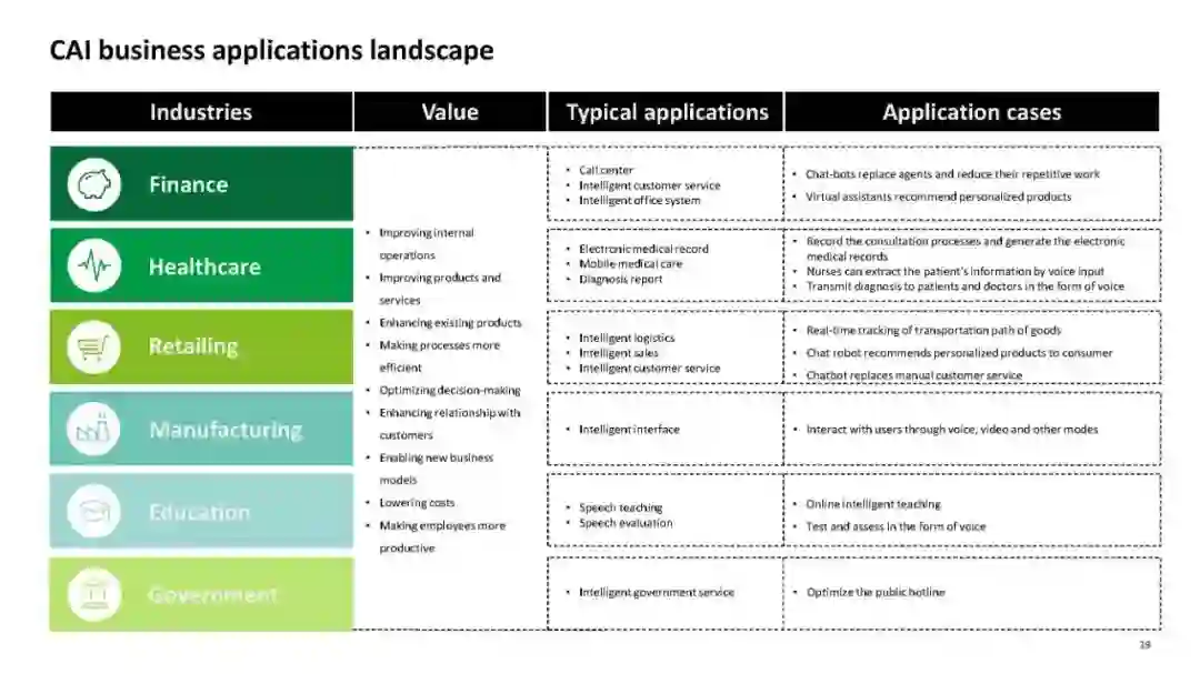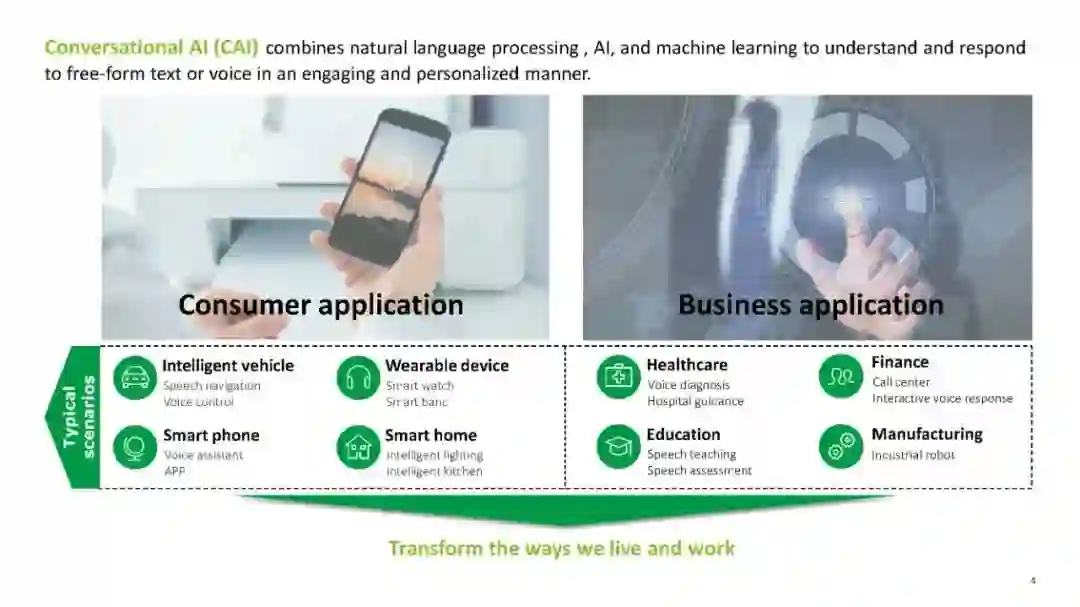 基于语音的交互逐渐成为数字时代人机交互的主流。与此同时,人工智能领域的不断创新突破成为全球技术研究的焦点。德勤调查显示,全球人工智能市场到2019年已达1.9万亿美元,预计到2025年将超过6万亿美元,2017 - 2025年复合增长率为30%。人工智能的快速发展为人机交互提供了理论和技术支持。因此,人工智能与人机交互相结合的对话式人工智能(CAI)降低了交互障碍,扩大了用户基础,在各个领域展示了广泛的用例和无限的商业价值。在这个临界点CAI的快速增强,德勤发布德勤会话人工智能白皮书,德勤的见解阐述CAI技术和在行业应用解决方案,并引入CAI四个愿景,设计工作的未来,重塑未来的生活,打破语言的障碍,和人类和机器连接。