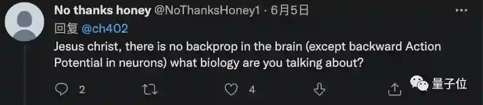 与此同时也有网友反驳道,就拿反向传播机制来说,我们的大脑根本都不存在这个东西,怎么能说机器学习和生物学很像呢?
