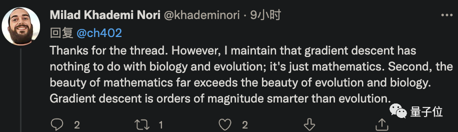 “我觉得梯度下降还是一个数学问题,和进化无关;并且我还得说一句,数学之美远超进化和生物学之美,更别提梯度下降比进化聪明了几个数量级呢。”有人进一步回怼。