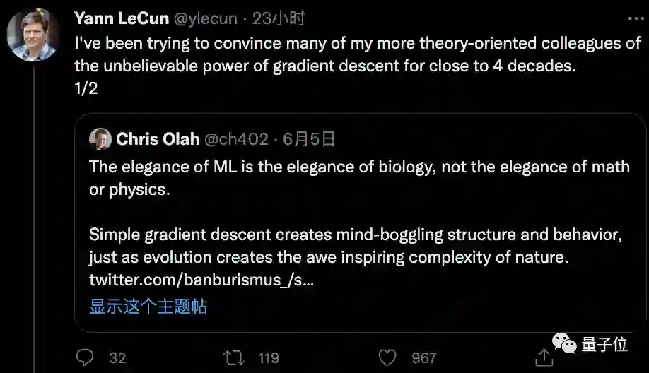 就连LeCun都转发起来,称自己四十年来都在说服身边搞理论的同事相信梯度下降法拥有多么不可思议的力量。