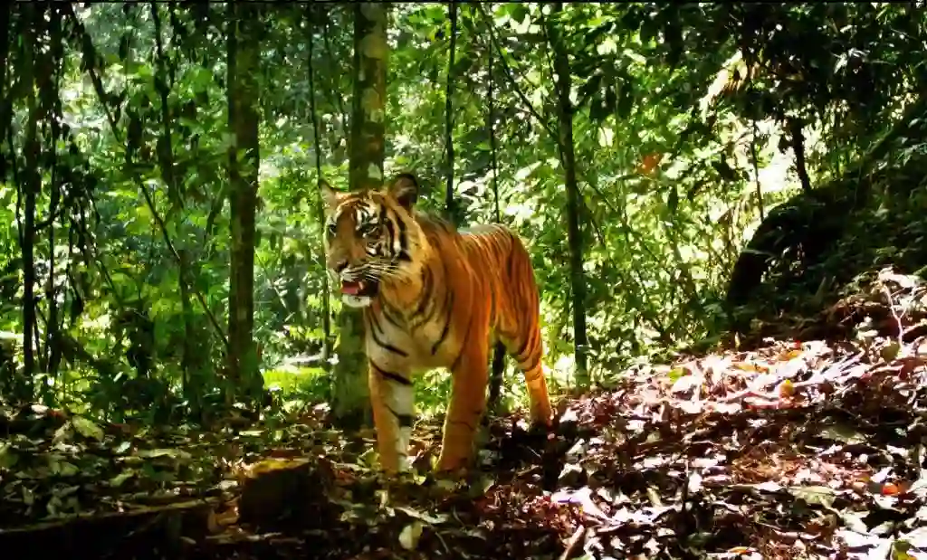 苏门答腊虎的栖息地和研究设计。a. 2012年苏门答腊岛的森林覆盖;b. 研究点放置了相机,用黄色点表示;c. 武吉巴里杉西拉坦国家公园中的苏门答腊虎在山脊上正巡视它的领地。