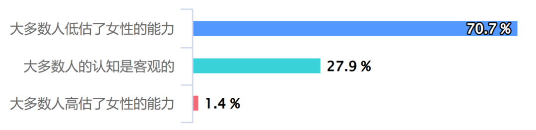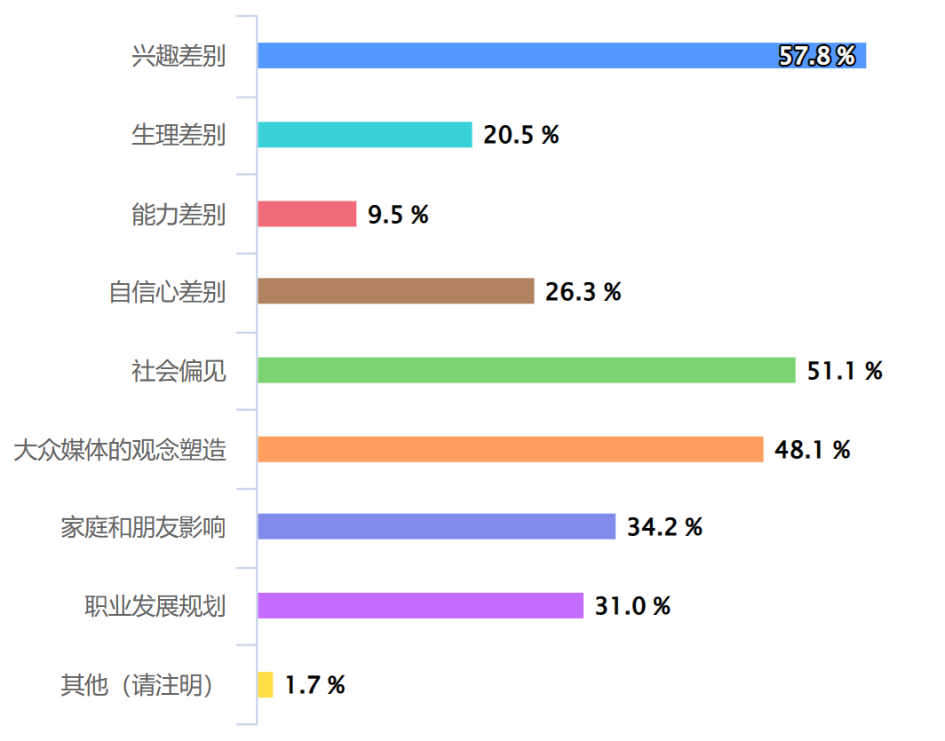 同时,若单独统计女学生的数据,会发现对于这五项能力,女生选择“不存在差别”及“女生好于男生”两项加总的比例均高于总体,即女生选择“男生好于女生”的比例低于总体。这表明相较于男生对其的评估,女生对自己能力的评价会高一些。因此,提升领域内女性从业者的比例将促进良性循环,帮助女性得到更多认可,从而进一步提升女性从业者比例。在五项能力中,结果差值最高的是“逻辑思考能力”和“领导力”。