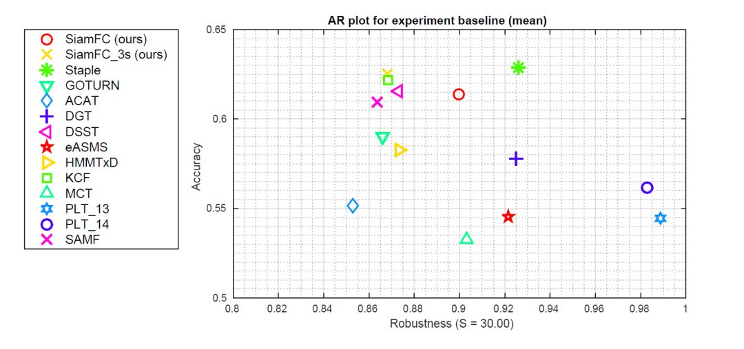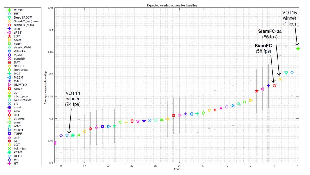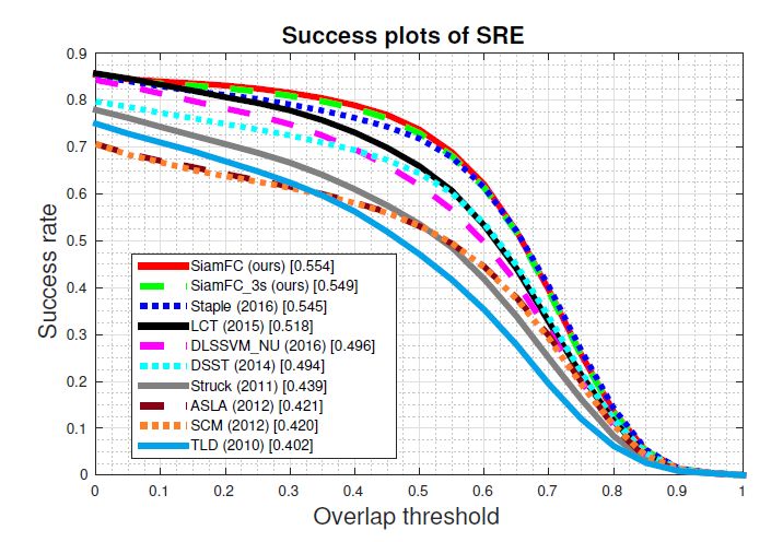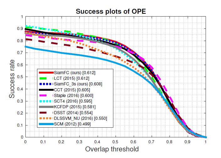 SiamFC方法第一个使用ILSVRC15数据集中的视频数据训练了一个端到端的全卷积双胞胎网络进行跟踪,速度快、精度有竞争力,可以说是给出了一个范例,克服了上述两点阻碍。