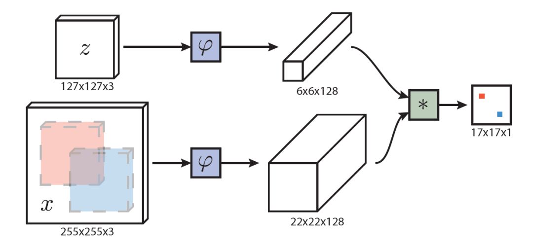 使用全卷积网络的好处是,可以扩大搜索区域x,使用ψ作用后的特征进行cross-correlation操作,类似于密集采样,但计算量小,速度快。
