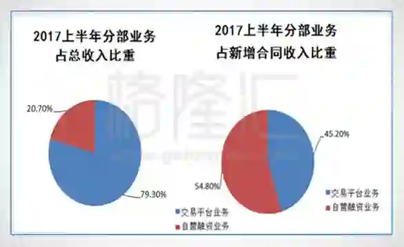 而如果我们看2017年上半年,各分项业务占新增合同收入的比重,交易平台业务占比已经达到45%,几乎半壁江山了。