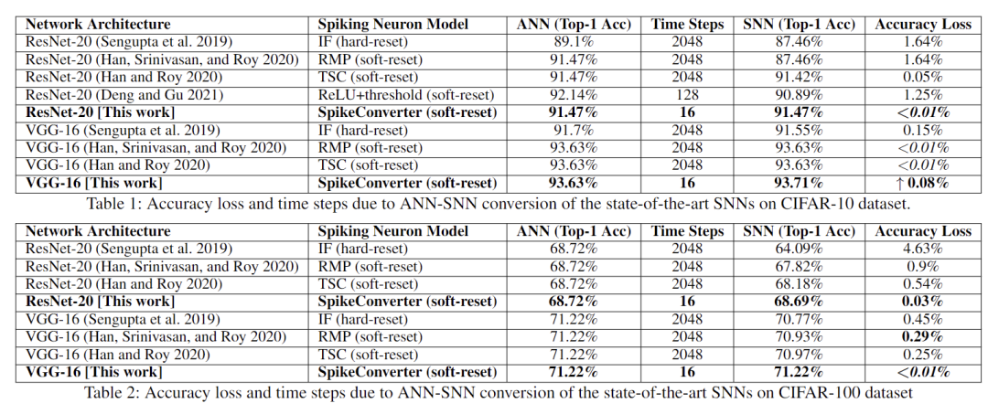 文章使用 CIFAR-10/100,以及 ImageNet 数据集进行实验。实验结果表明文章提出的方法在仅需要 16 个时间步的情况下,可以达到和传统神经网络几乎一致的精度。极大节省空间存储和计算代价的情况下取得了最佳的性能,具体实验结果参见论文。部分结果如下。