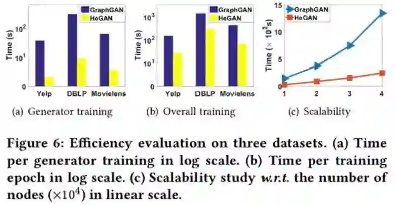 从图中我们可以看到HeGAN的训练时间和节点数成线性关系,时间性能大大优于基于softmax的GraphGAN。