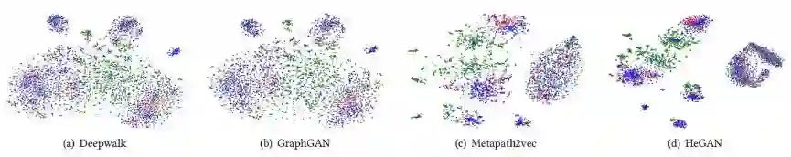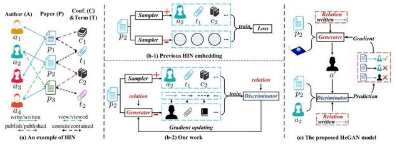我们提出了一种新型的HeGAN框架,该框架不仅能够感知关系以获取丰富的语义,而且还具有高效的生成负样本的机制。
