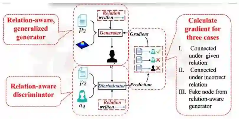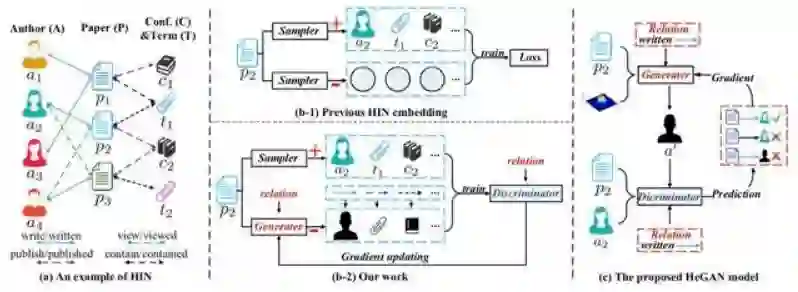 生成对抗网络(GAN)已被开发用于学习各种应用中鲁棒的潜在表示。GANs依赖于对抗性学习的思想,判别器和生成器相互竞争,不仅要训练更好的判别模型,还要学习底层的数据分布。后者使得模型对稀疏或有噪声数据的鲁棒性更强[13,24],也提供了更好的样本来降低标注要求。鉴于这些优点,基于GAN的网络表示学习已经有了一些初步的尝试。然而,这些研究只研究了同质网络,没有考虑节点和关系的异构性,导致在语义丰富的异构信息网络上性能不理想。